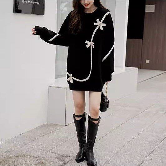 スウェット レディース リボン オーバーサイズ ライン 長袖 ラウンドネック ロング丈 プルオーバー チュニック レトロ ゆったり かわいい ガーリー フェミニン カジュアル ストリート おしゃれ