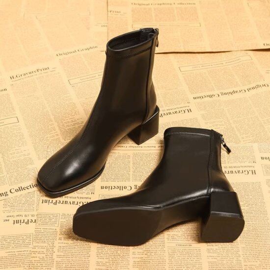 ショートブーツ レディース スクエアトゥ バックファスナー スリム 太ヒール チャンキーヒール ミドルヒール 5cmヒール シンプル 安定感 歩きやすい きれいめ エレガント レザーブーツ おしゃれ