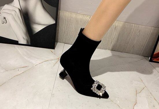 ショートブーツ レディース ビジュー ポインテッドトゥ スリム フェイクレザー エコレザー デザインヒール ハイヒール 6cmヒール ラインストーン きれいめ エレガント 個性的 華やか おしゃれ