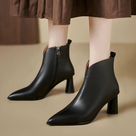 ショートブーツ レディース アンクルブーツ スリット Vカット レザーブーツ 太ヒール 6.5cmヒール ポインテッドトゥ サイドファスナー レトロ クラシカル きれいめ エレガント おしゃれ