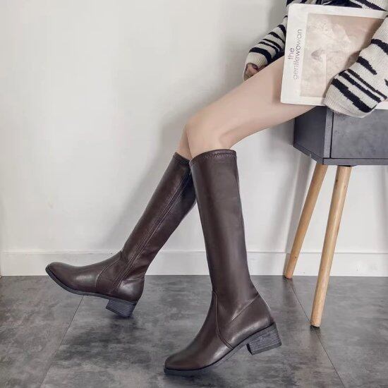 ロングブーツ レディース スクエアトゥ フェイクレザー ロング丈 太ヒール ミドルヒール ローヒール 4cmヒール サイドファスナー シンプル きれいめ カジュアル 歩きやすい オフィス おしゃれ