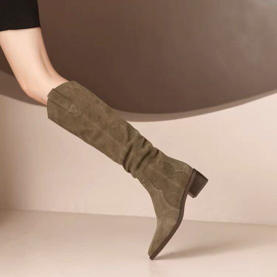 ロングブーツ レディース ウェスタンブーツ スエードブーツ 本革 ポインテッドトゥ Vカット 太ヒール ミドルヒール 5cmヒール レトロ クラシカル シック きれいめ カジュアル おしゃれ