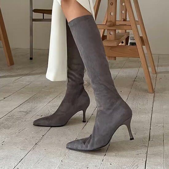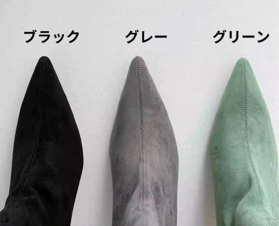 ロングブーツ レディース スエードブーツ ポインテッドトゥ ストレッチブーツ スリム タイト ハイヒール ピンヒール 8cmヒール グリーン きれいめ エレガント セクシー カジュアル おしゃれ