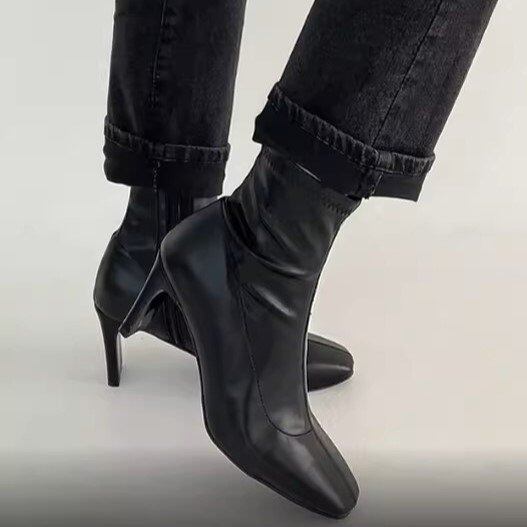 ショートブーツ レディース スエードブーツ スクエアトゥ フェイクレザー エコレザー ストレッチ サイドファスナー ハイヒール 7cmヒール レトロ クラシカル きれいめ カジュアル おしゃれ