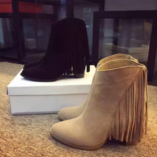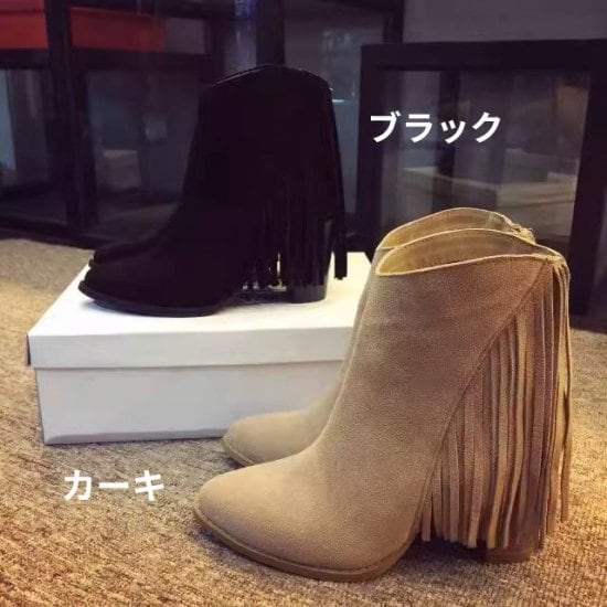 ショートブーツ レディース フリンジ アンクルブーツ スエードブーツ ポインテッドトゥ ウェスタン 太ヒール 8cmヒール トライバル 個性的 レトロ かわいい ガーリー カジュアル おしゃれ