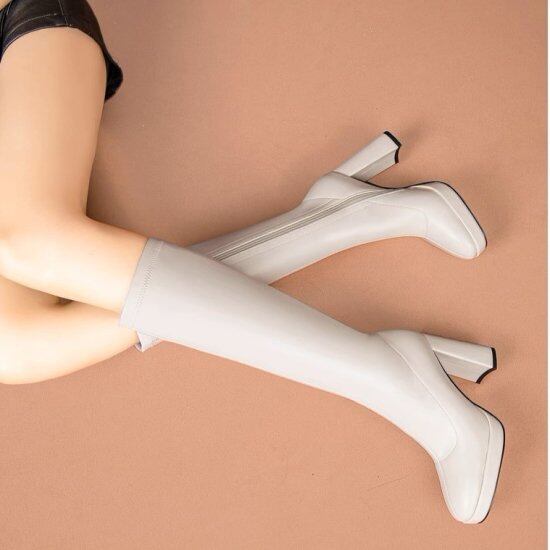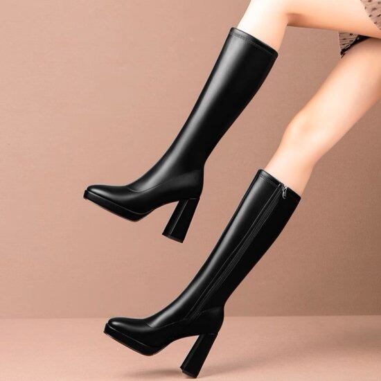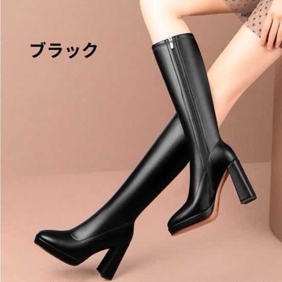 ロングブーツ レディース ポインテッドトゥ 太ヒール ハイヒール 9cmヒール プラットフォーム フェイクレザー サイドファスナー 2color 脚長 美脚 きれいめ カジュアル 防水 おしゃれ