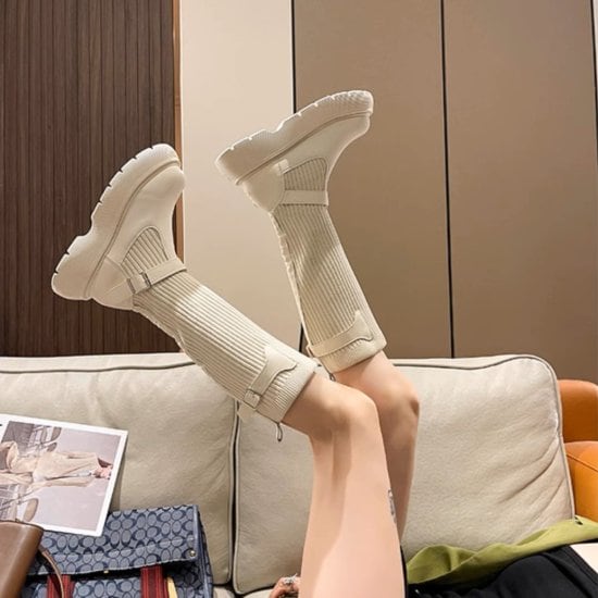 ロングブーツ レディース ソックスブーツ 異素材ミックス ラウンドトゥ ベルト リブニット 厚底ブーツ フェイクレザー エコレザー コンビ 個性的 ユニーク 5cmヒール カジュアル おしゃれ