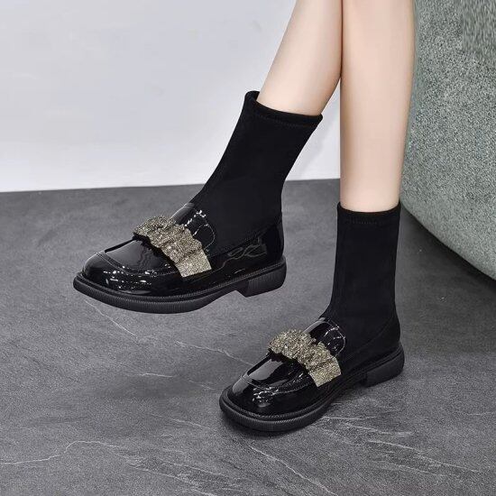 ショートブーツ レディース ローファー ストレッチブーツ ソックスブーツ ラウンドトゥ 太ヒール ローヒール 3cmヒール ビジュー フラット 個性的 ユニーク カジュアル ブーツ おしゃれ