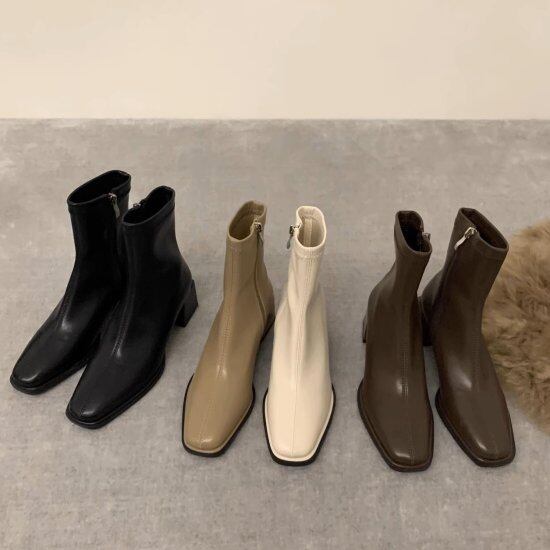 ショートブーツ レディース スクエアトゥ フェイクレザー エコレザー アンクルブーツ 太ヒール チャンキーヒール 5cmヒール サイドファスナー シンプル シック カジュアル きれいめ おしゃれ