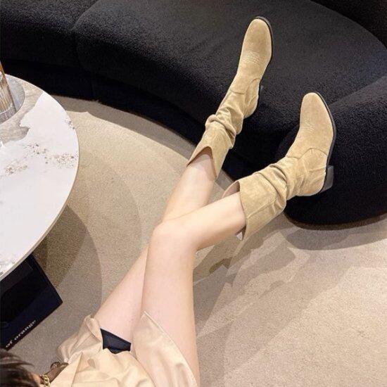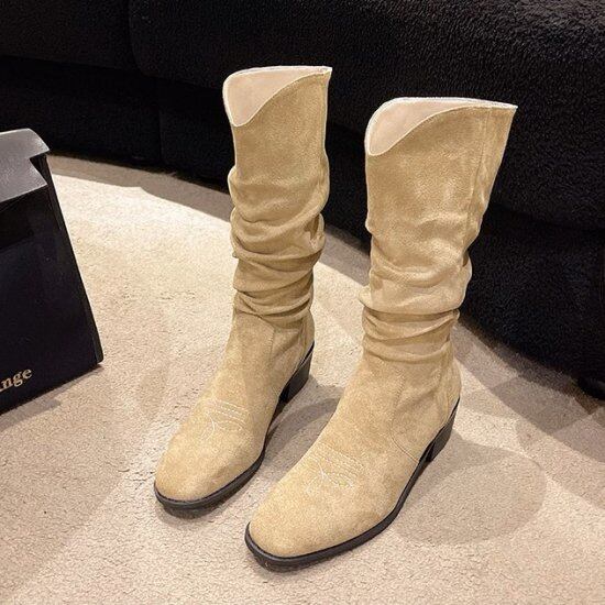 ロングブーツ レディース ウェスタンブーツ スエードブーツ Vカット ラウンドトゥ ポインテッドトゥ 太ヒール チャンキーヒール 5cmヒール ゆったり レトロ カウボーイ カジュアル おしゃれ