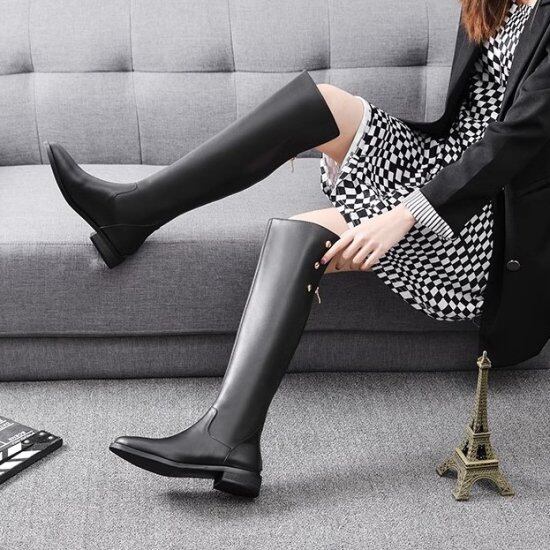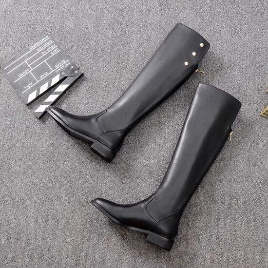 ロングブーツ レディース バックファスナー ラウンドトゥ フェイクレザー エコレザー 太ヒール ローヒール 3cmヒール ストレート シンプル スタッズ きれいめ エレガント カジュアル おしゃれ