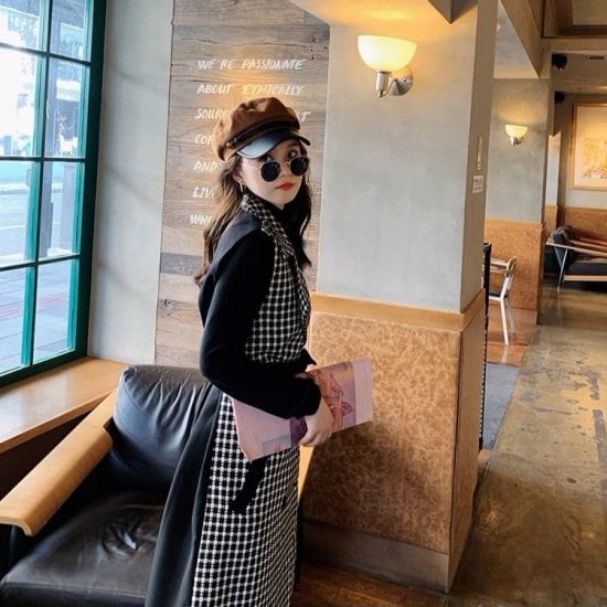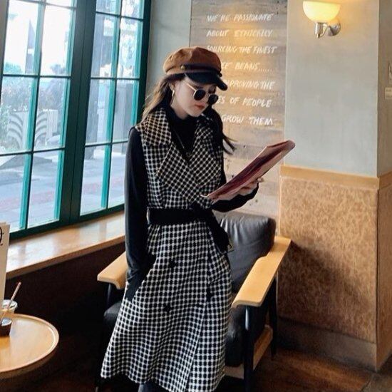 ジレ レディース チェック柄 テーラードカラー ノースリーブ ロングベスト ロングジレ ジャンパースカート ベルト バイカラー ミディアム丈 ひざ丈 きれいめ カジュアル おしゃれ