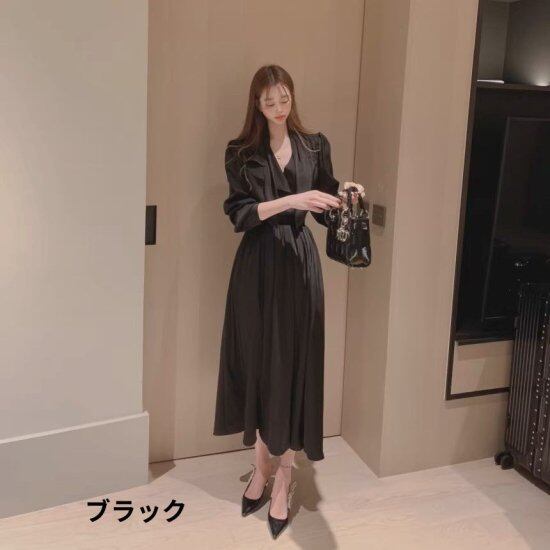ワンピース レディース ボウタイワンピース Vネック リボン 長袖 ギャザースカート ロングワンピース ミディアム丈 ミモレ丈 光沢 きれいめ 上品 エレガント シック オフィス おでかけ おしゃれ