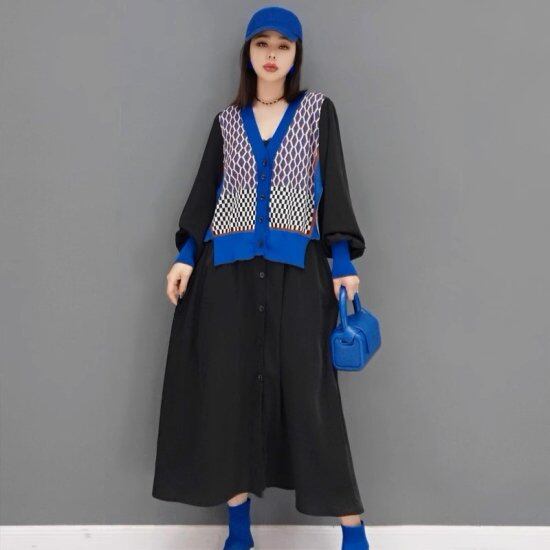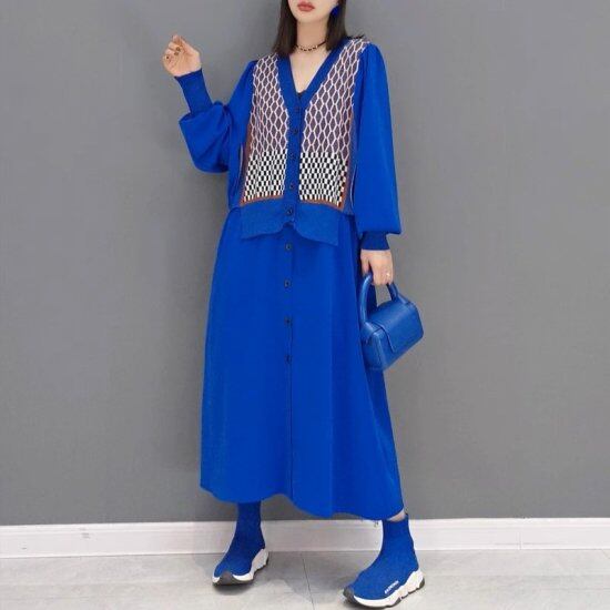 ロングワンピース レディース Vネック レイヤード風 重ね着風 Aライン 長袖 ランタンスリーブ パフスリーブ フェイクレイヤード 個性的 ユニーク ゆったり カジュアル ドレス ロング おしゃれ