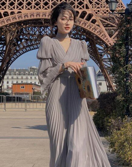ロングワンピース レディース プリーツワンピース Vネック 長袖 Aライン ロング丈 マキシ丈 ボリューム袖 パフスリーブ カシュクール ハイウエスト きれいめ エレガント 華やか ドレス おしゃれ