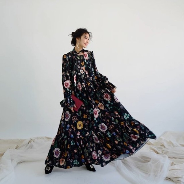 ロングワンピース レディース 花柄ワンピース ティアードワンピース 長袖 ベルスリーブ パフスリーブ Aライン フラワーモチーフ ボタニカル ボウタイ リボン きれいめ エレガント 華やか おしゃれ