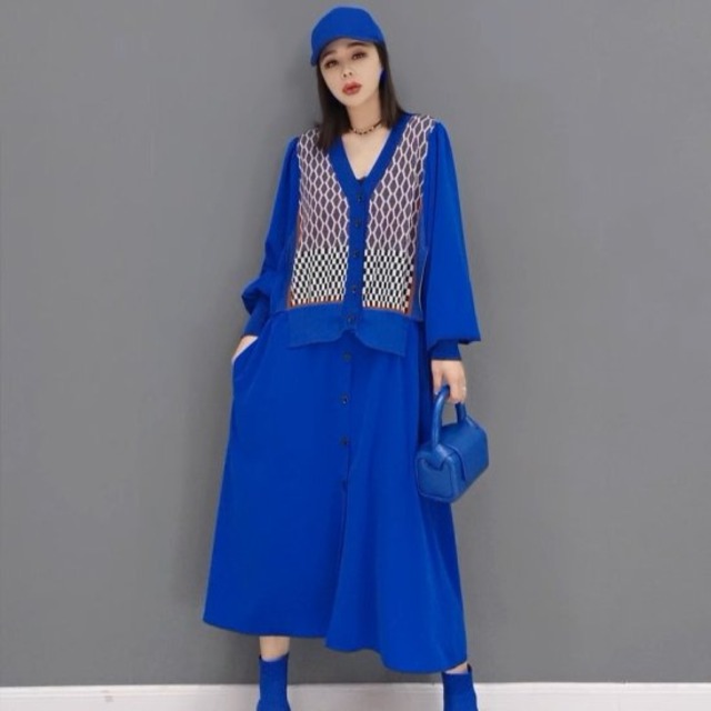 ロングワンピース レディース Vネック レイヤード風 重ね着風 Aライン 長袖 ランタンスリーブ パフスリーブ フェイクレイヤード 個性的 ユニーク ゆったり カジュアル ドレス ロング おしゃれ