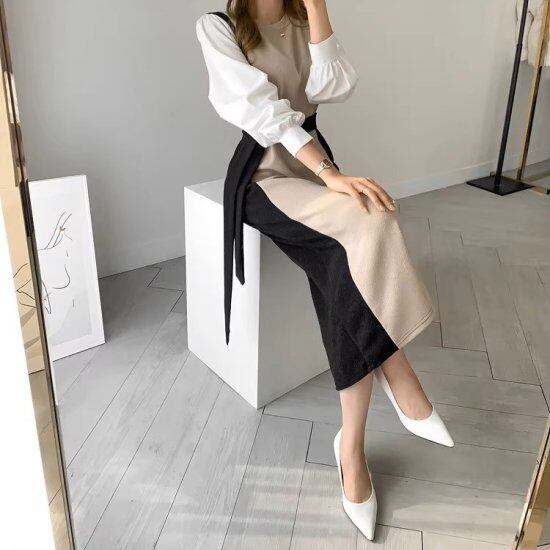 ニットワンピース レディース バイカラーワンピース 長袖 異素材MIX 重ね着風 ラウンドネック パフスリーブ ミモレ丈 ロングワンピース ベルト タイト レトロ きれいめ カジュアル おしゃれ