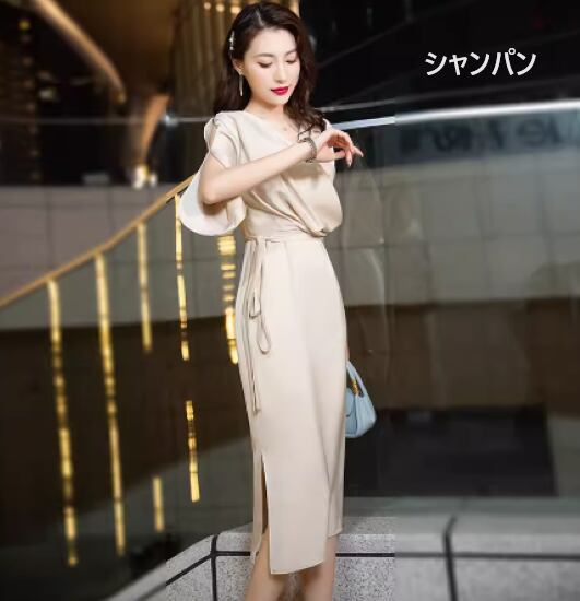 パーティードレス レディース 結婚式ドレス 演奏会ドレス ワンピースドレス きれいめ エレガント フォーマル お呼ばれ Vネック カシュクール ウエストリボン スリット 二次会 ハイウエスト 五分袖