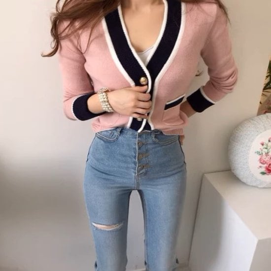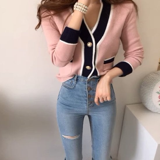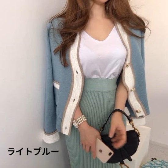 ニットカーディガン レディース Vネック 長袖 バイカラー 金ボタン パイピング ポケット ショート丈 ゴールドボタン かわいい きれいめ エレガント 上品 カジュアル オフィス おでかけ おしゃれ