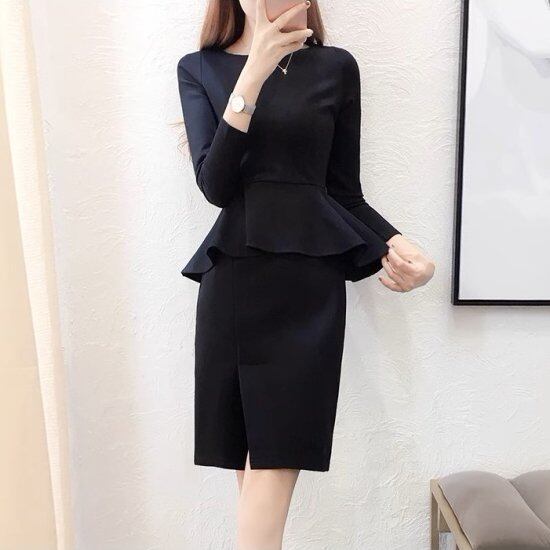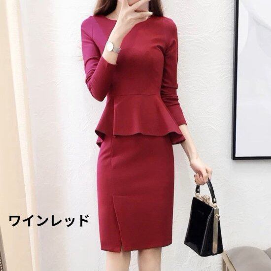 ワンピース レディース セットアップ風 ペプラム 長袖 タイトワンピース スリット ひざ丈 ミディアム丈 ラウンドネック 無地 スーツ風 きれいめ 上品 エレガント お呼ばれ オフィス おしゃれ