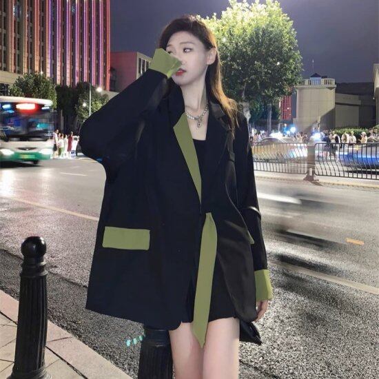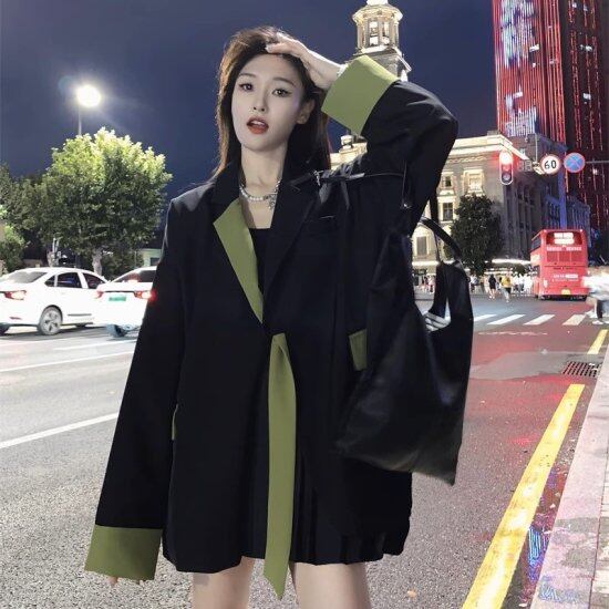 ジャケット レディース オーバーサイズ バイカラー テーラードジャケット リボン ポケット カフス ビッグシルエット ゆったり ルーズ 配色 ライトアウター カジュアル 個性的 ユニーク おしゃれ