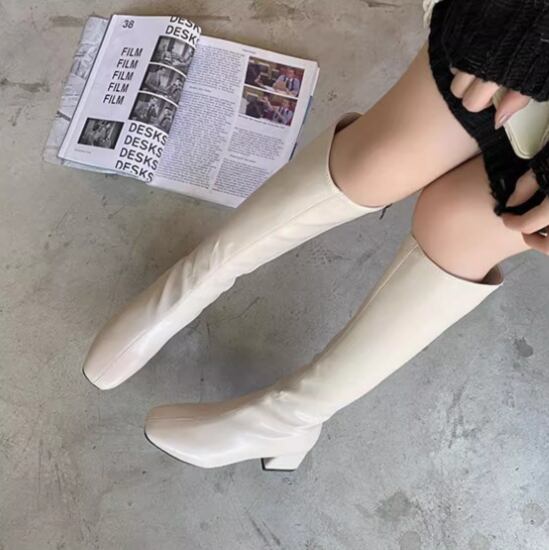 ロングブーツ レディース ブーツ 靴 シューズ シンプル 無地 サイドジッパー 太ヒール チャンキーヒール 美脚 脚長 カジュアル お出かけ おしゃれ きれいめ 秋冬 PU ファッションブーツ 女性