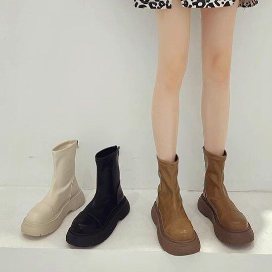 ショートブーツ レディース 厚底ブーツ ラウンドトゥ バックファスナー フェイクレザー エコレザー ミドルヒール 4cmヒール ボリューム カジュアル ストリート 脚長 歩きやすい 厚底 おしゃれ