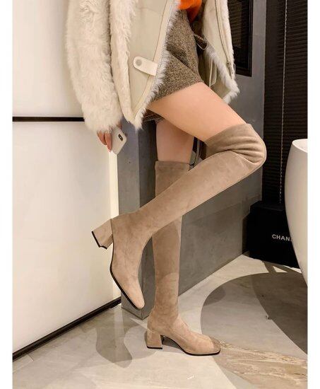 ロングブーツ レディース ニーハイブーツ スクエアトゥ スエードブーツ ひざ上 太ヒール チャンキーヒール 5cmヒール ストレッチ ガーリー カジュアル 脚長 美脚 2color ロング おしゃれ