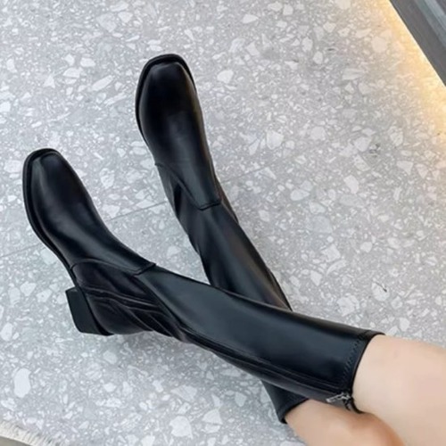 ロングブーツ レディース スクエアトゥ フェイクレザー エコレザー シンプル 太ヒール ローヒール 4cmヒール スリム サイドファスナー きれいめ カジュアル オフィス 3color おしゃれ