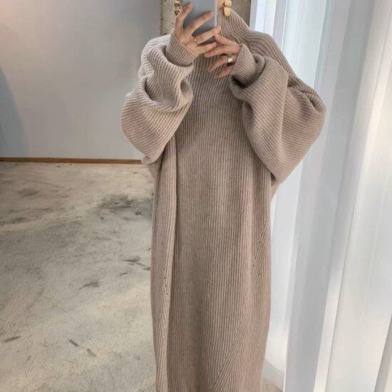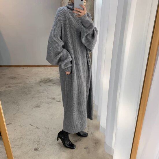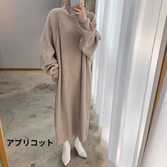 ニットワンピース レディース オーバーサイズ 長袖 ハイネック ラグランスリーブ ボリューム袖 ゆったり ビッグシルエット 体型カバー かわいい カジュアル 3color おでかけ 部屋着 おしゃれ