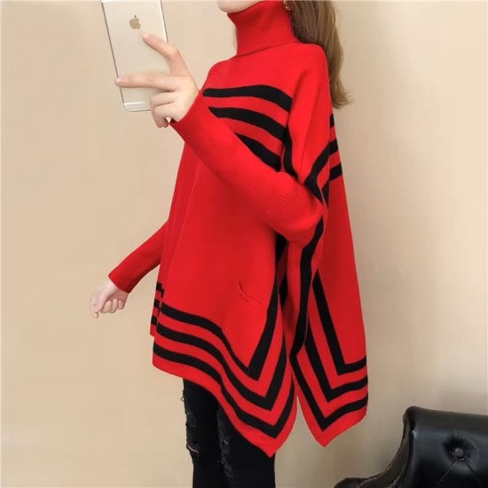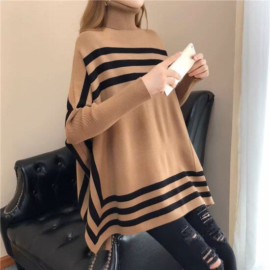 ニットセーター レディース マント ライン 長袖 バットスリーブ ハイネック タートルネック スクエア ボーダー ストライプ ロング丈 チュニック 個性的 3color 体型カバー おしゃれ