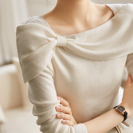 ニットセーター レディース リボン プルオーバー 長袖 スリム タイト 薄手 スクエアネック ボートネック レトロ クラシカル きれいめ エレガント ガーリー オフィス デート おでかけ おしゃれ
