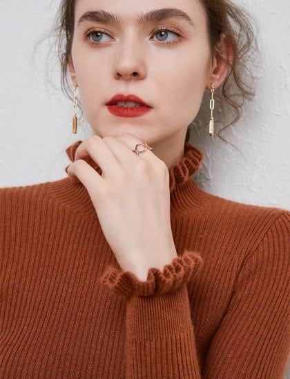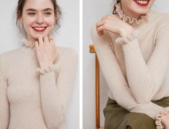 ニットセーター レディース フリルニット 長袖 ハイネック フリルネック リブニット スリム タイト メロウニット レトロ レイヤード かわいい ガーリー 無地 シンプル おでかけ デート おしゃれ