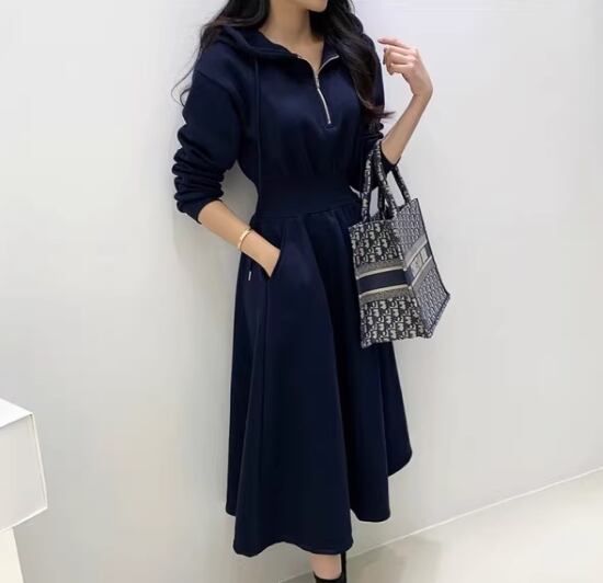 ロングワンピース レディース ワンピース Aラインワンピース 長袖 ハーフジップ ハイウエスト カジュアル シンプル 無地 お出かけ おしゃれ フード付き スウェットワンピース ファッション 女性