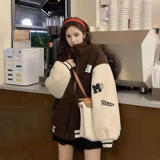 ボアブルゾン レディース ボアジャケット バイカラー 長袖 スタンドカラー 襟付き スタジャン オーバーサイズゆったり レトロ ユニセックス かわいい カジュアル ブルゾン 3color おしゃれ