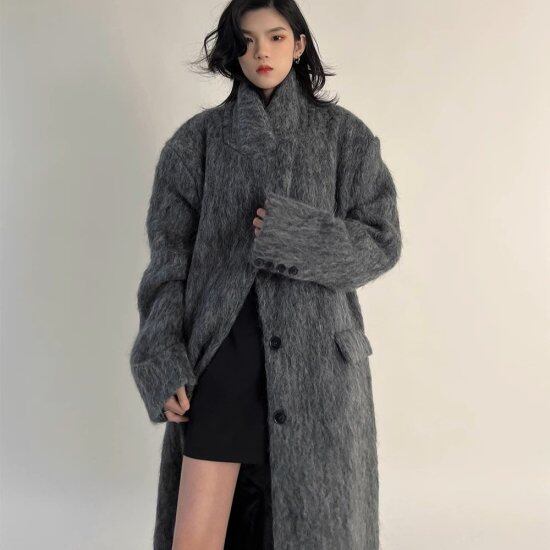 ロングコート レディース チェスターコート グレー ロング丈 マキシ丈 テーラードカラー シングルブレスト シャギー レトロ オーバーサイズ メンズライク ユニセックス マニッシュ おしゃれ