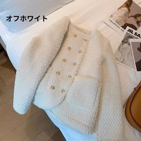 ショートコート レディース ファーコート ファージャケット ノーカラー フェイクファー ダブルブレスト 金ボタン ポケット レトロ クラシカル かわいい きれいめ 上品 おでかけ オフィス おしゃれ