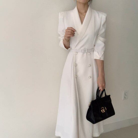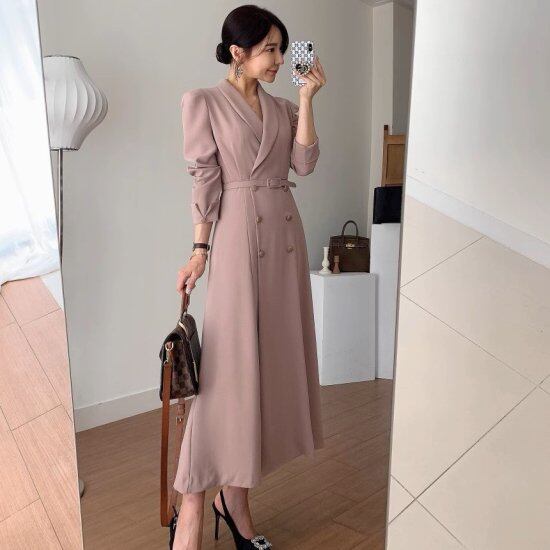 ロングワンピース レディース Vネック ショールカラー 長袖 ベルト ダブルブレスト ミモレ丈 ロング丈 無地 レトロ クラシカル きれいめ エレガント おでかけ オフィス 3color おしゃれ