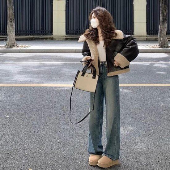 ムートンジャケット レディース ブルゾン ショートジャケット ジャンパー フェイクレザー ボア オーバーサイズ レトロ ユニセックス マニッシュ ハード ストリート かわいい カジュアル おしゃれ