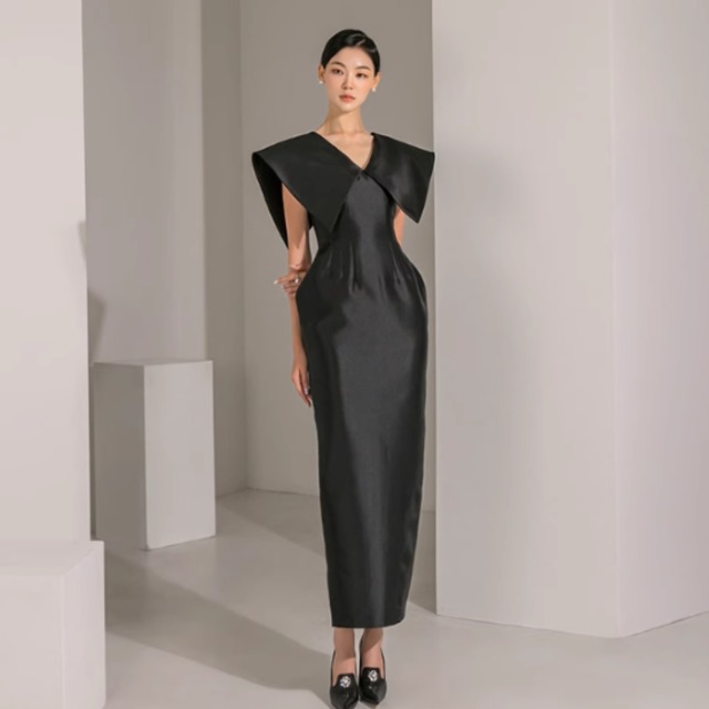 パーティードレス レディース 演奏会ドレス 結婚式ドレス ワンピースドレス ロングドレス ロングワンピース Vネック ビッグカラー ハイウエスト きれいめ エレガント お呼ばれ フォーマル 無地