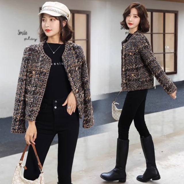 ツイードジャケット レディース ノーカラージャケット ラウンドネック 長袖 ミックスツイード ショートジャケット レトロ クラシカル きれいめ 上品 エレガント カジュアル オケージョン おしゃれ