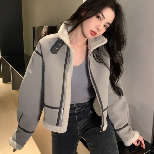 ボアジャケット レディース ショートジャケット スタンドカラー 長袖 ライン スエード ムートン ファスナー ジッパー クロップド丈 かわいい カジュアル おしゃれ フェイクレザー 裏ボア おしゃれ