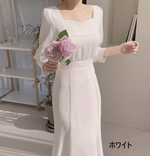 パーティードレス レディース 演奏会ドレス 結婚式ドレス ワンピースドレス スクエアネック 七分袖 シンプル 無地 きれいめ エレガント お呼ばれ フォーマル 二次会 ハイウエスト ミドル丈 女性