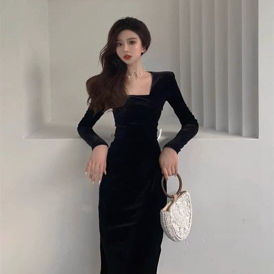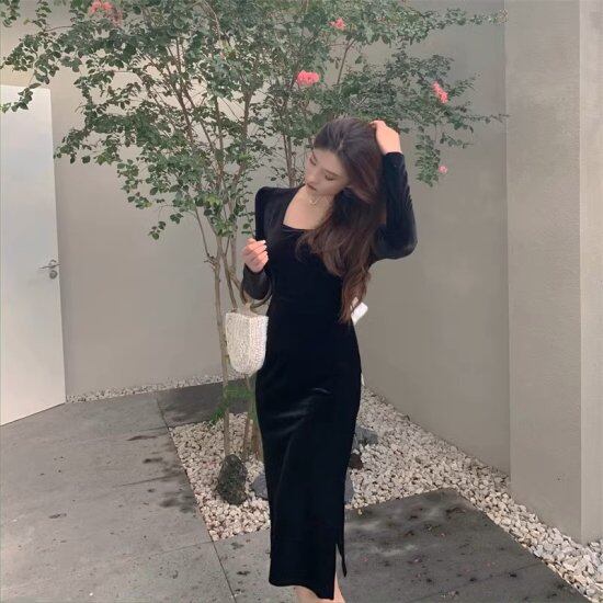 パーティードレス レディース バックリボン タイトワンピース スクエアネック 長袖 スリム スリット バックシャン リボン エレガント セクシー ミモレ丈 結婚式 演奏会 謝恩会 二次会 おしゃれ