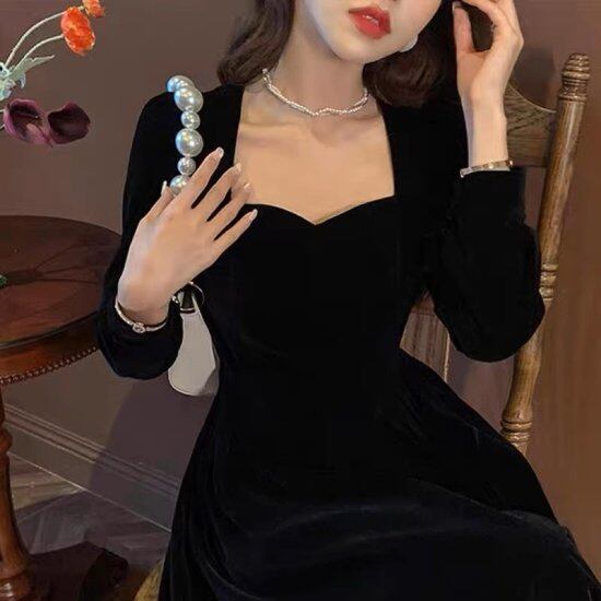 パーティードレス レディース Aラインワンピース ベルベット 長袖 ハートネック スクエアネック ハイウエスト ミモレ ロング エレガント 結婚式 演奏会 披露宴 謝恩会 二次会 ベロア おしゃれ