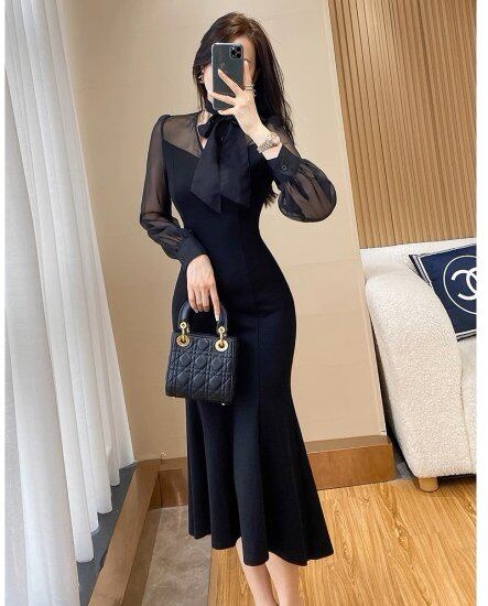 パーティードレス レディース マーメイド シースルー 長袖 ワンピース ミモレ丈 ロング丈 リボンタイ スリム タイト エレガント きれいめ 結婚式 演奏会 二次会 披露宴 パーティー おしゃれ