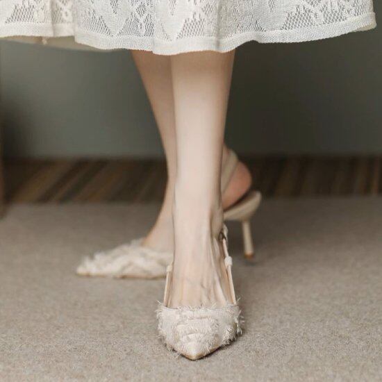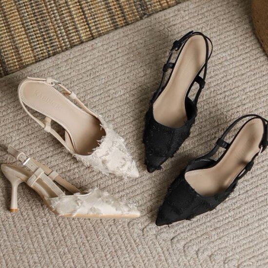パンプス レディース サンダル バックストラップ フリンジ ハイヒール 7cmヒール ファブリック 布 きれいめ エレガント カジュアル 2color オフィス おでかけ パーティー おしゃれ