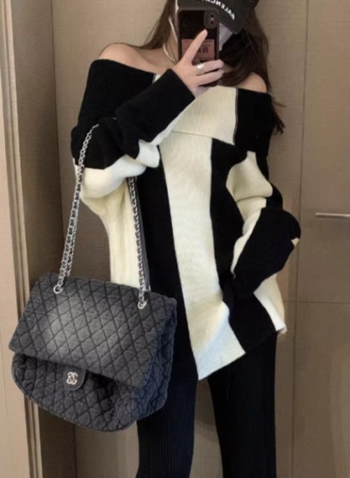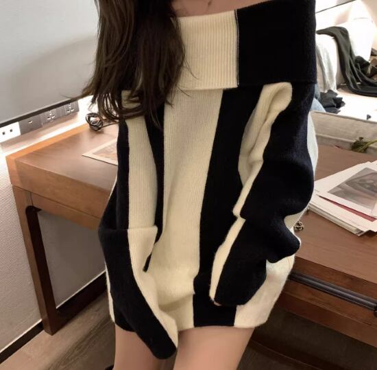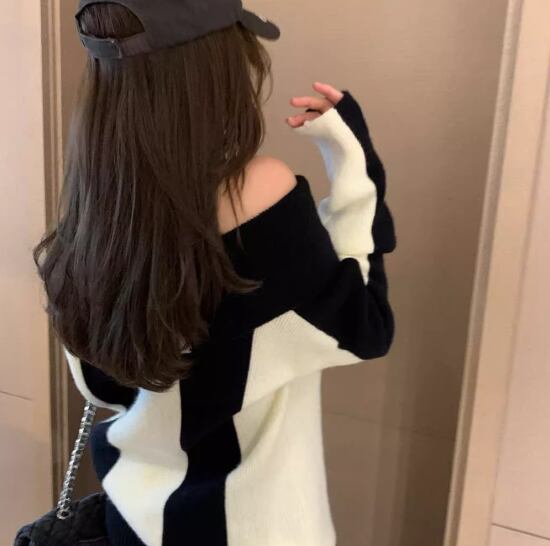 ニットセーター レディース ニット セーター プルオーバー オフショルダー 肩出し セクシー ストライプ バイカラー コントラストカラー 長袖 無地 ゆったり ルーズ オーバーサイズ カジュアル