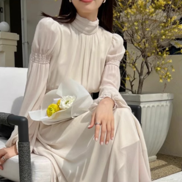 パーティードレス レディース ロングワンピース 長袖 パフスリーブ 透け感 スタンドカラー シャーリング Aライン レトロ ミモレ丈 ロング丈 エレガント 結婚式 披露宴 演奏会 謝恩会 おしゃれ